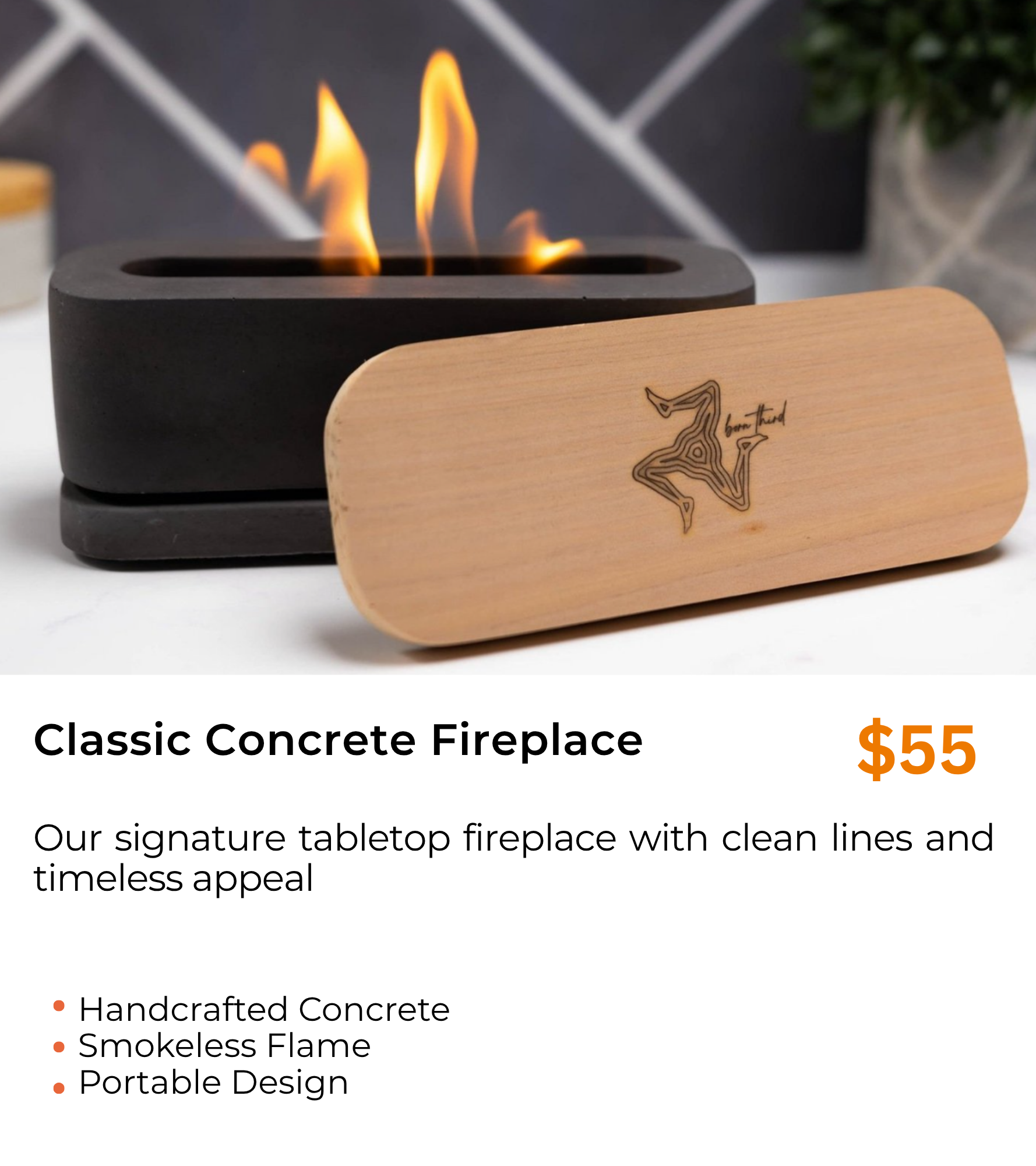 Each Born Third fireplace is meticulously crafted from premium concrete, designed to be the centerpiece of your gatherings.